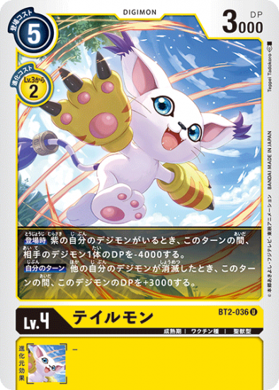 【登場時】紫の自分のデジモンがいるとき、このターンの間、相手のデジモン1体のDPを-4000する。【自分のターン】他の自分のデジモンが消滅したとき、このターンの間、このデジモンのDPを+3000する。