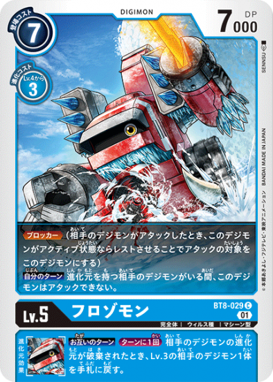 ≪ブロッカー≫(相手のデジモンがアタックしたとき、このデジモンがアクティブ状態ならレストさせることでアタックの対象をこのデジモンにする)【自分のターン】進化元を持つ相手のデジモンがいる間、このデジモンはアタックできない。
