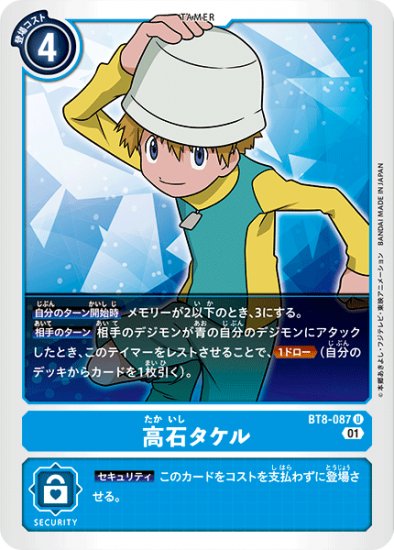【自分のターン開始時】メモリーが2以下のとき、3にする。【相手のターン】相手のデジモンが青の自分のデジモンにアタックしたとき、このテイマーをレストさせることで、≪1ドロー≫(自分のデッキからカードを1枚引く)。
