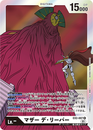 【お互いのターン】このデジモンはアタックできず、相手の効果を受けない。【メイン】[ターンに1回]他の自分の「マザー デ・リーパー」がいないとき、自分の「ADR-02=サーチャー」1体か手札の「ADR-02=サーチャー」1枚を、このデジモンの進化元の1番下に置く。【自分のターン】[ターンに1回]手札の特徴に「デ・リーパー」を持つカードを登場させるとき、支払う登場コストをこのデジモンの進化元1枚ごとに-1できる。