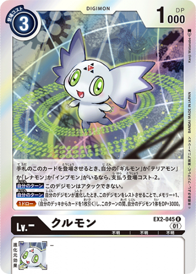 手札のこのカードを登場させるとき、自分の「ギルモン」か「テリアモン」か「レナモン」か「インプモン」がいるなら、支払う登場コスト-2。【自分のターン】このデジモンはアタックできない。【自分のターン】自分のデジモンが進化したとき、このデジモンをレストさせることで、メモリー+1、≪1ドロー≫(自分のデッキからカードを1枚引く)し、このターンの間、自分のデジモン1体をDP+3000。