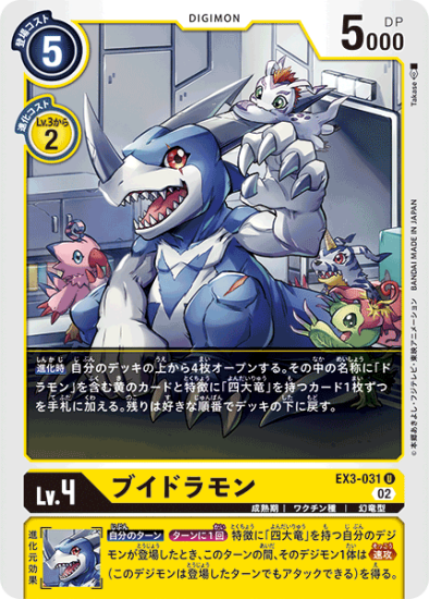 【進化時】自分のデッキの上から4枚オープンする。その中の名称に「ドラモン」を含む黄のカードと特徴に「四大竜」を持つカード1枚ずつを手札に加える。残りは好きな順番でデッキの下に戻す。