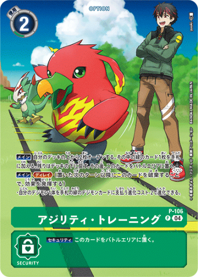 ・自分のデジモン1体を手札の緑のデジモンカードに支払う進化コスト-2で進化できる。